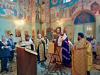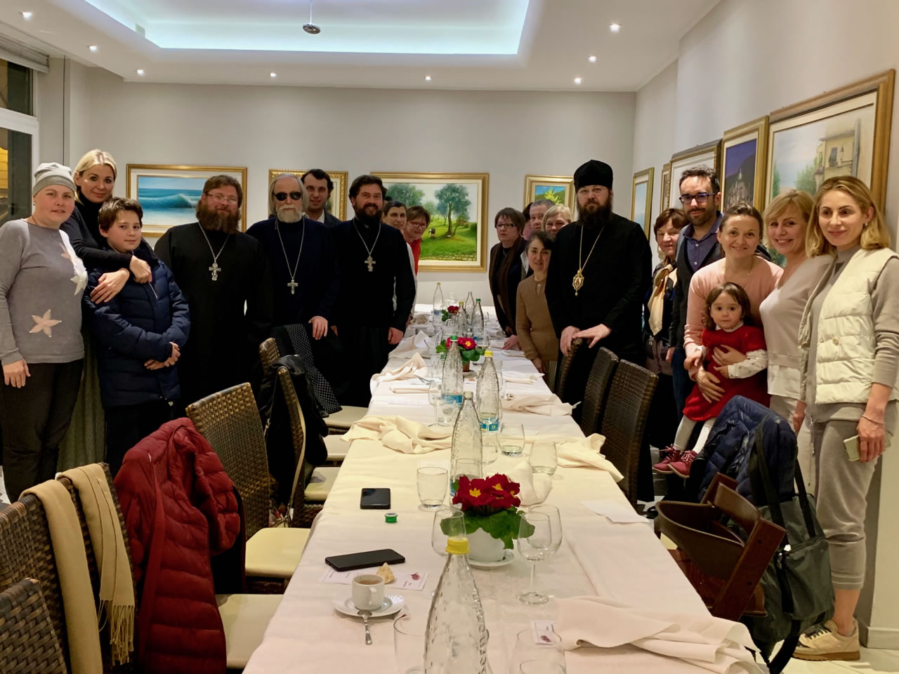 During his brief visit, Bishop Irenei was welcomed by the parish rector, Priest Dionysius Baykov, a cleric of the Western European Diocese, and met with the parish council to discuss its life and pastoral works within the diocese. In the evening, parishioners gathered together with the Bishop in the church to pray a moleben with akathist to St Seraphim before his precious icon. The service was concelebrated by His Grace, Priest Dionysius, along with Archpriest Georgiy Blatinskiy of the diocesan parish in Florence, and Priest Evgeny Nikitin of the parish in Menton, France. Following the service, Bishop Irenei met with parishioners for a discussion in the church, addressing many matters of the life of faith, spiritual works, and the parish’s place in the diocese. A reception was then held in a nearby restaurant, providing the parishioners the occasion to converse with their bishop and celebrate the progress of their spiritual life.