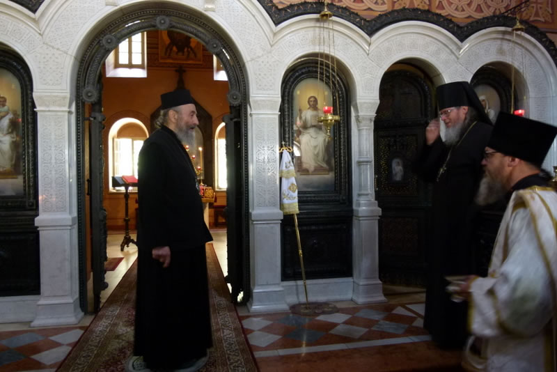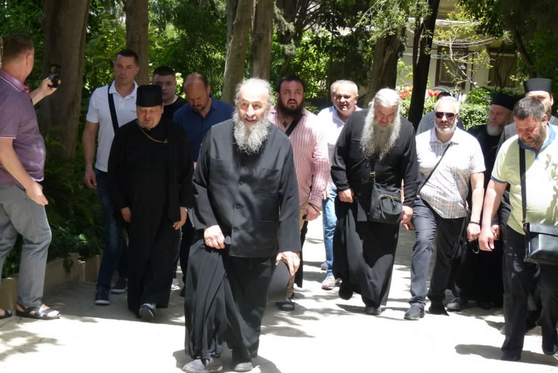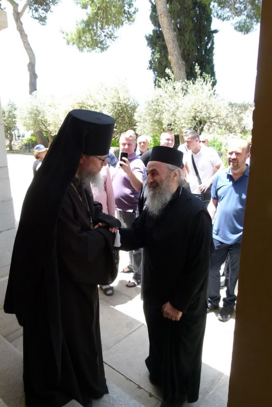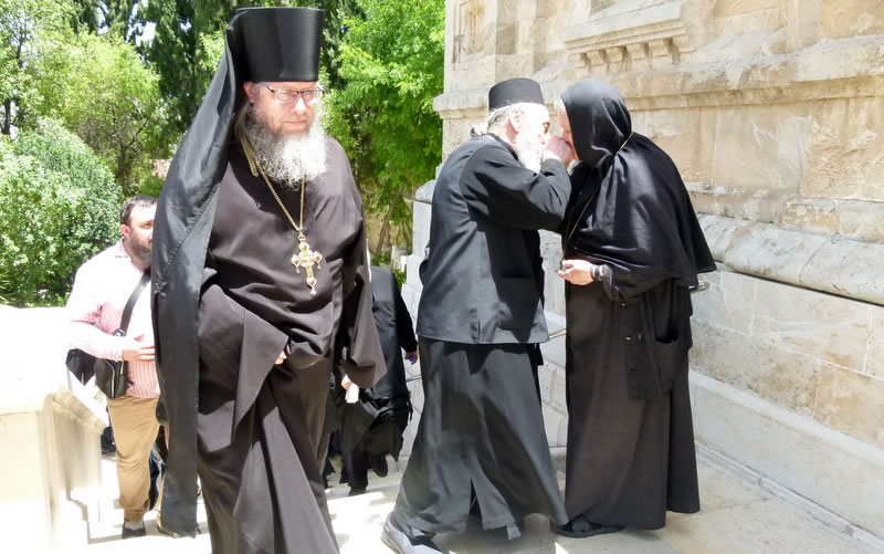 On Saturday, May 18, 2019, His Beatitude Metropolitan Onouphry of Kiev and All Ukraine visited the Convent of St Mary Magdalene in Gethsemane, Jerusalem, where he was greeted by Archimandrite Roman (Krassovsky), Chief of the Russian Ecclesiastical Mission in Jerusalem, his monks and Abbess Elizabeth (Smelic) and her nuns. Accompanied by the singing of “The Angel Cried,” His Beatitude venerated the altar table and holy relics of the “Royal Church” of the convent. After a brief prayer service, Fr Roman welcomed Metropolitan Onouphry, assuring him of the prayers for the canonical Church he heads and the people of Ukraine by the monastics of the Russian Orthodox Church Outside of Russia.