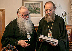 The meeting of the hierarchs took place at the Kievan Lavra of the Caves. They discussed cooperating in the area of theological education. Present at the meeting was His Grace Vicar Bishop Silvester of Belogorodsk, Rector of the Kiev Theological Schools, Protopriest Rostislav Snegirev, Assistant Rector of the Kiev Theological Academy and Seminary’s Department of Foreign Exchange Students, as well as Archbishop Peter’s delegates.