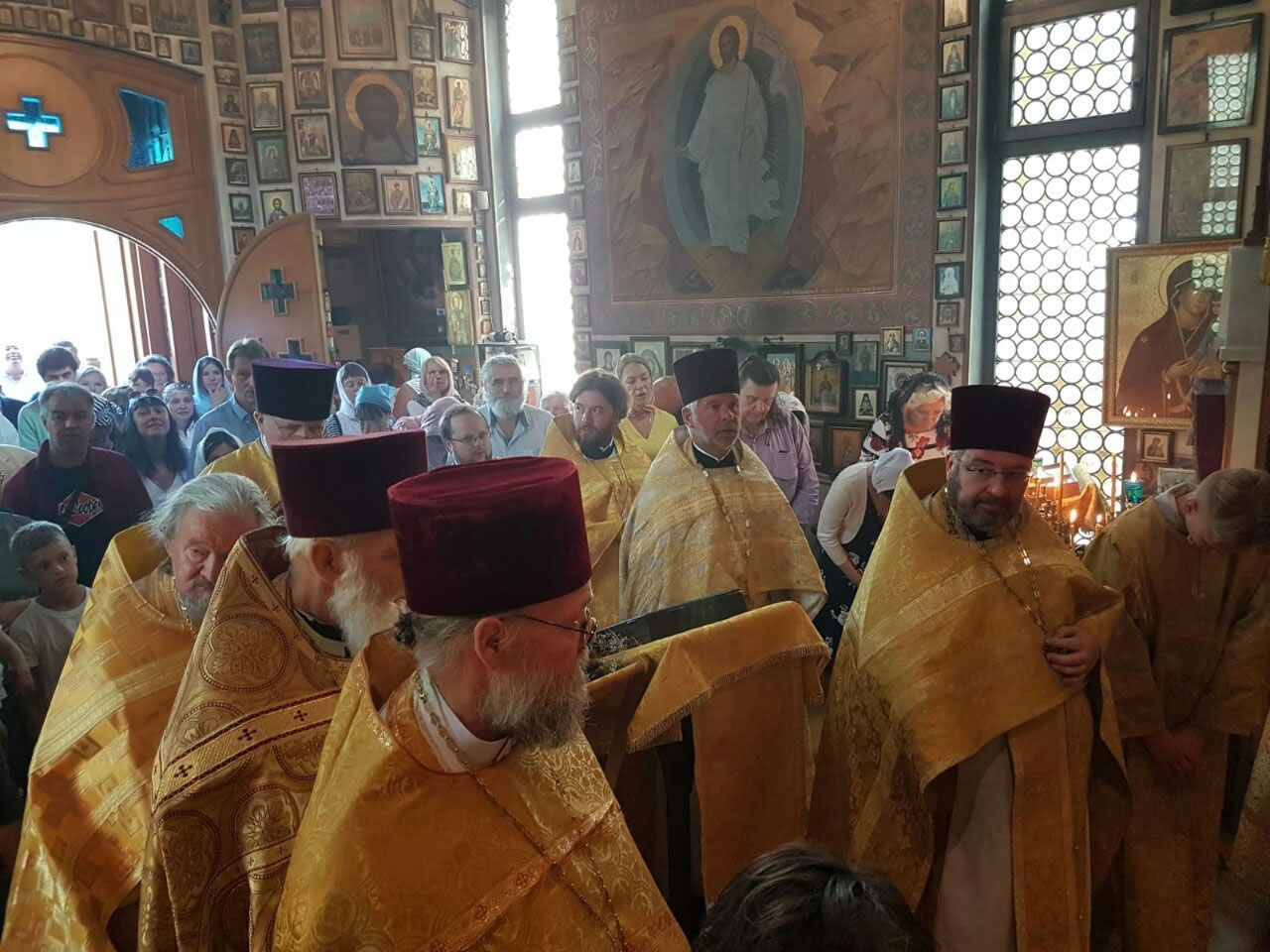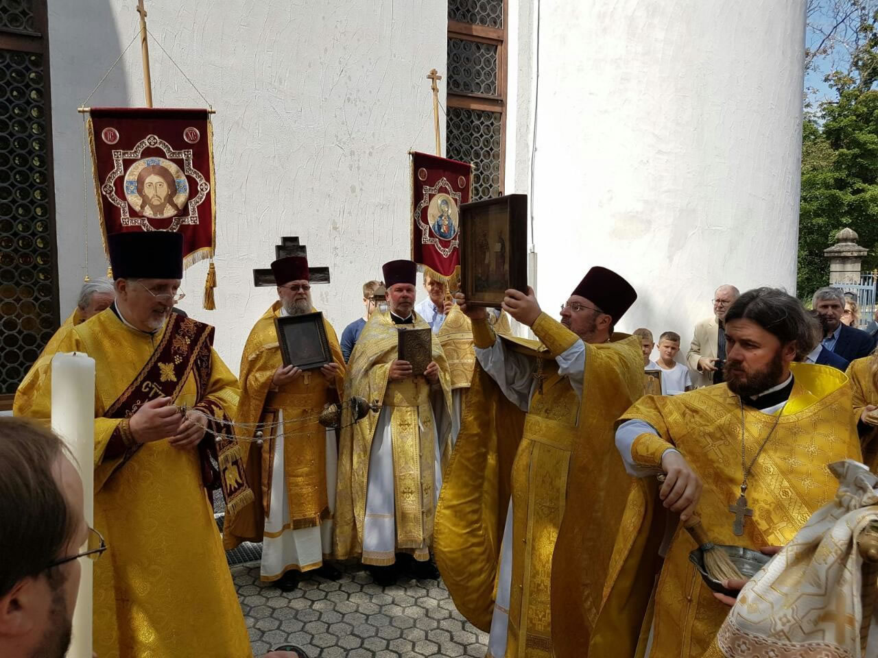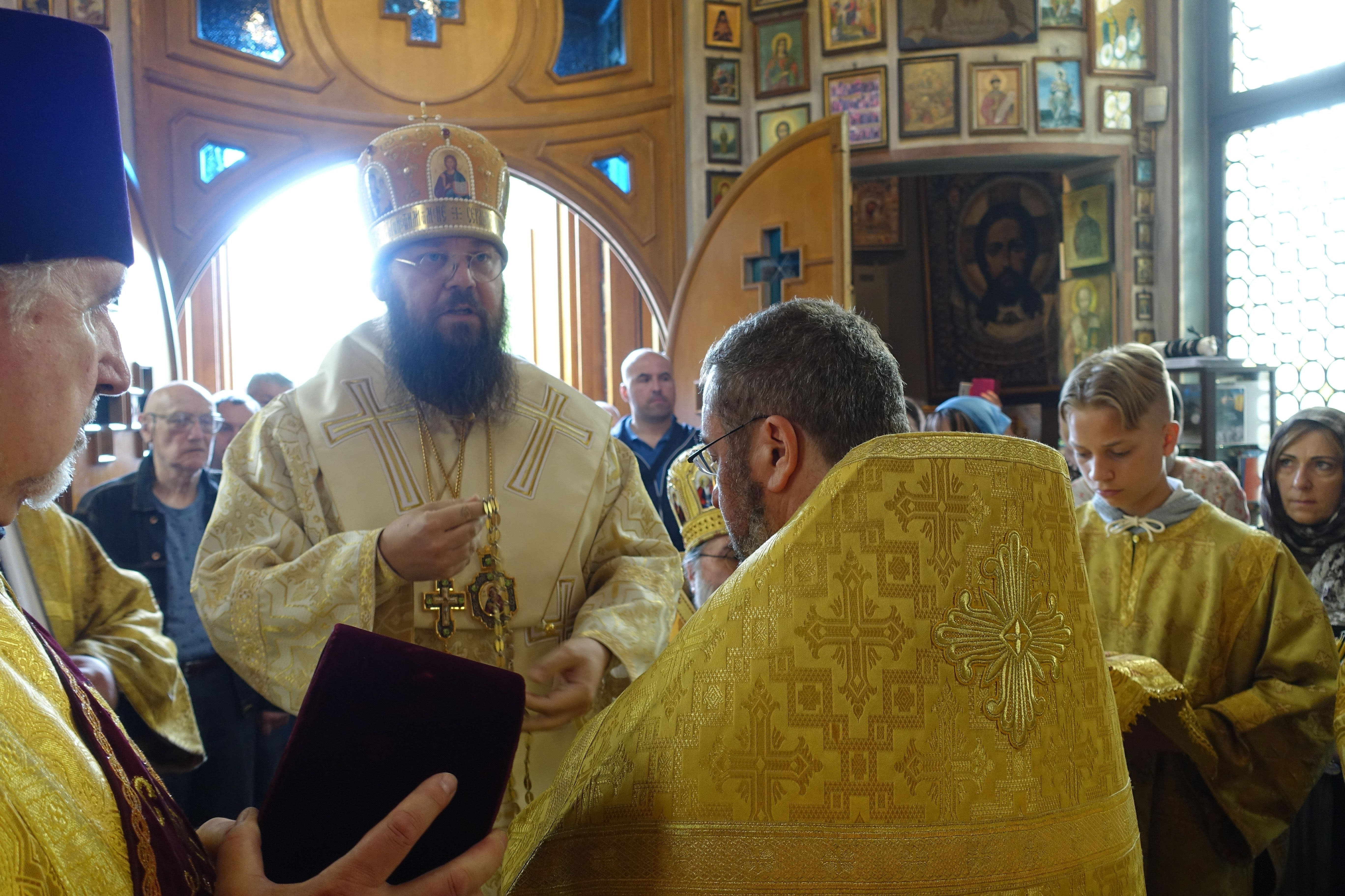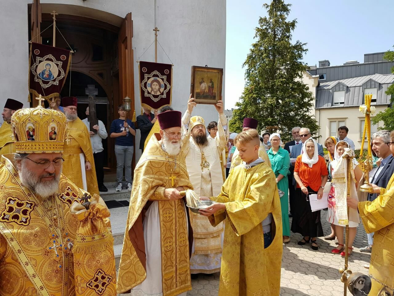 On Friday, July 12, 2019, SS Peter and Paul Church in Luxembourg celebrated its 90th anniversary. Heading divine services was His Grace Bishop Irenei of London and Western Europe along with His Grace Bishop Alexander of Vevey, Vicar of the Western European Diocese, and a host of clergymen from France, Switzerland and the USA, and attended by a large gathering of local and visiting worshipers. During the minor entrance of Divine Liturgy, Priest George Machtalere, parish rector, was granted by the Synod of Bishops the right to wear the gold pectoral cross.