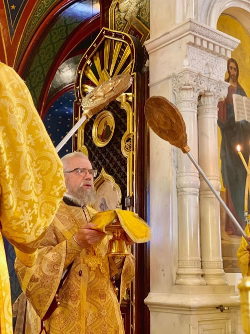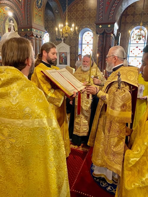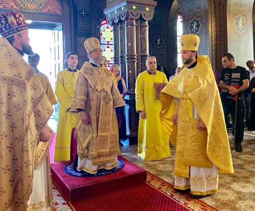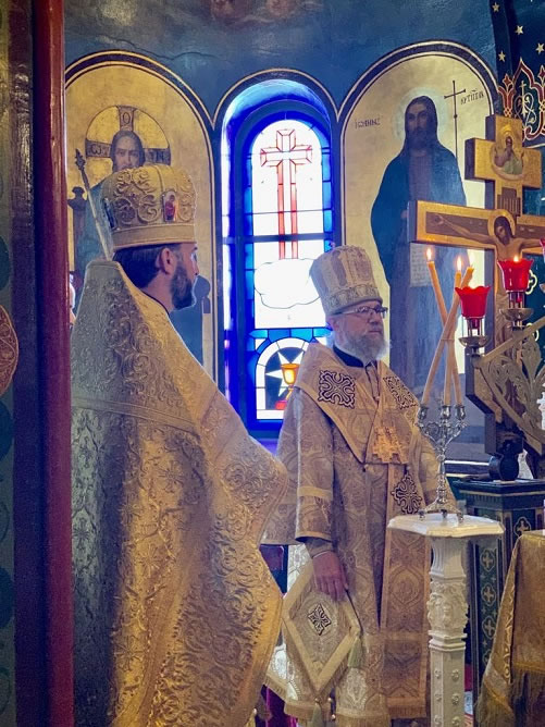A bishop of the Ukrainian Orthodox Church officiates at Liturgy at Elevation of the Cross Cathedral