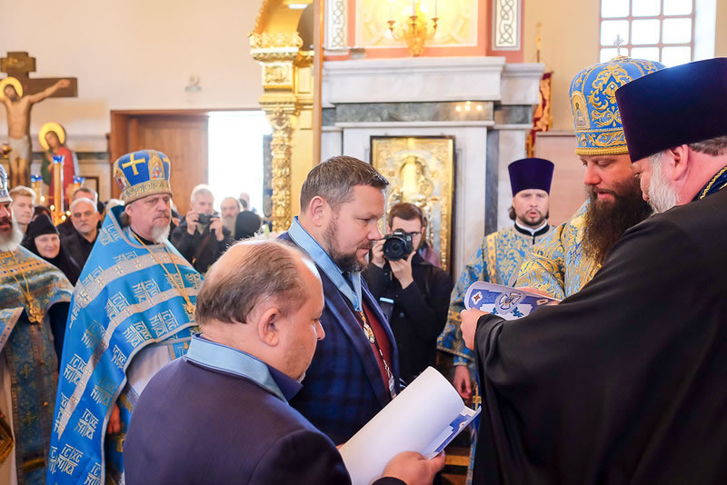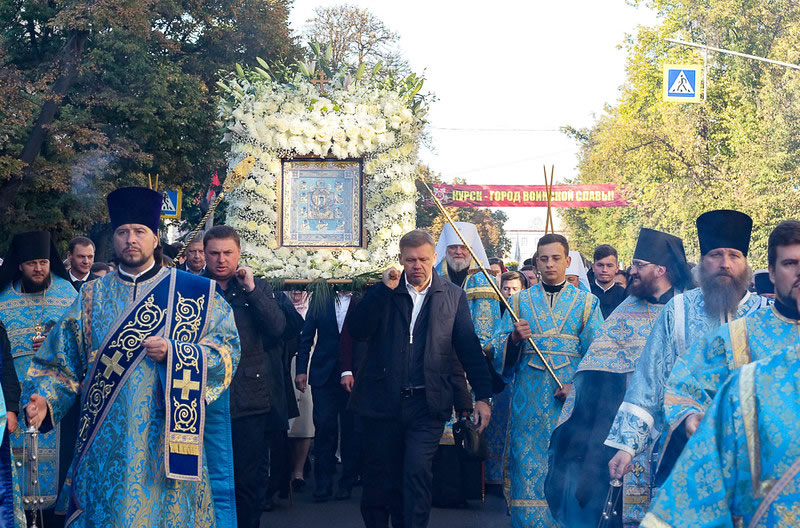 The Kursk-Root Icon arrived in Kursk three hours later. At Vvedensky Church, the miraculous image was greeted by the people of Kursk and guests. Metropolitan German blessed the city and the procession with the icon, after which it continued through the streets of the city. On Perekalsky Square, the icon was greeted by the Governor of the Kursk Region, Roman Starovoit and Kursk Mayor Viktor Karamyshev, who joined the procession.