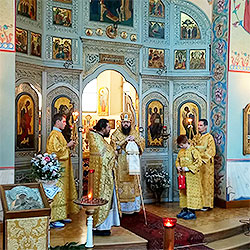 Greeted by the Parish Rector, Priest Dionysi Baikov, before the Saturday evening Vigil, Bishop Irenei was met at the church door by a host of faithful. Vigil was served with great solemnity and beauty, thanks in large part to the labors of the parish choir, under the direction of Ioanna Kyrianchuk. On Sunday morning, His Grace was met at the porch with the traditional bread and salt, presented to him by a large collection of children who gathered for the greeting, and who also formed a children’s choir that sang portions of the Divine Liturgy.