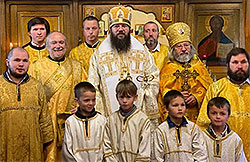 At the little entrance, Bishop Irenei laid the mitre upon the head of Archpriest Michael, one of the most senior clergymen of the Diocese, on behalf of the Holy Synod of Bishops. At the same time, he bestowed upon Deacon Alexander the right to wear the double orarion, in honor of his years of service in the holy diaconate.