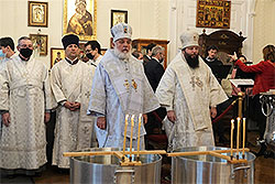 Upon completion of Liturgy, His Eminence greeted all with the great feast, wishing them good health and reminding them of the significance of holy water and how it should be used. The hierarch called to mind the words of the ever-memorable Metropolitan Vitaly (Ustinov; +2006), who said that "the walls of our homes are also made subject to our sins, and thus they too require yearly blessing and renewal."