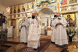 Officiating the divine services was His Grace Eastern American Diocesan Vicar Bishop Nicholas of Manhattan, co-served by cathedral dean Archpriest Andrei Sommer, Priest Zivojin Jakovljevic (cleric of the Serbian Church in the USA), Protodeacon Nicolas Mokhoff (cathedral cleric), and Hierodeacon Panteleimon (Jigalin; diocesan cleric). Praying in the altar was the First Hierarch of the Russian Church Abroad, Metropolitan Hilarion of Eastern America and New York.