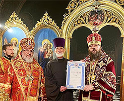 At the Little Entrance, His Grace Bishop Alexander, on behalf of the Ruling Bishop, awarded Priest Aviv Saliou-Diallo the right to wear the nabedrennik. At the conclusion of the Liturgy, Bishop Irenei bestowed the Synodal Order of the Sign, 2nd Degree, upon Protodeacon Michel Vernaz — a high honour granted by the Holy Synod of Bishops in recognition of the 45th anniversary of Fr Michel’s diaconal service, celebrated on this feastday — and presented him with both the medal of the Order and a gramota signed by the First Hierarch.