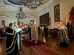 On the evening of March 29, the eve of the 5th Week of Great Lent, His Eminence performed the matins and the Great Canon of St Andrew of Crete at the Synodal Cathedral; he was joined by Cathedral Dean Archpriest Andrei Sommer and Archpriest Serafim Gan.