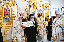 After Communion, His Beatitude Theophilus III, Patriarch of the Holy City of Jerusalem and All Palestine, arrived at the convent accompanied by Metropolitan Hesychius of Capitolia and Archbishop Aristarchus of Constantine with the patriarchal Archdeacon Mark and others. The Patriarch congratulated Metropolitan Mark, Bishop Job, Archimandrite Roman, Abbess Varvara with her sisters and pilgrims on the feast. In his speech, His Beatitude emphasized the importance of personal spiritual missionary work in order to profess the true faith in these difficult days in which enemies try to tear the Robe of the Orthodox Church. Vladyka Mark thanked the Patriarch of Jerusalem for coming and for his good wishes, and then many years were proclaimed for the Patriarch, at which time the sisters sang the “Patriarchal” Many Years.