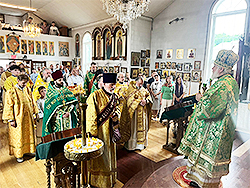 During vigil on the evening of Saturday, June 3, 2023, the magnificent Holy Trinity Cathedral, established in 1966, was full. The next day at Divine Liturgy, as the saying goes, "there was nowhere for an apple to fall." Concelebrating with His Eminence were the Rector of the parish, Mitred Archpriest Vladimir Malchenko (Dean of the Eastern Deanery of the Canadian Diocese) and Archpriest Vyacheslav Davidenko, along with Protodeacon Alexander Morin and Deacon Seth Davydenko. The cathedral choir sang with emotion, touchingly and at the same time solemnly under the direction of one of the most famous choir directors of the Russian Orthodox diaspora, Reader George Skok. It was difficult to determine the exact number of worshipers, since quite a lot of people found a place only in the narthex, but there were more than three hundred communicants.