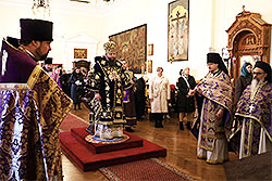 Upon completion of Liturgy, Metropolitan Nicholas officiated the Rite of Orthodoxy, which is traditionally served in the center of the church. Joining the serving clergy for the Rite were: Archimandrite Elevferiy (Skiba; dean of "Inexhaustible Chalice" Church), Archpriest Mark Burachek (dean of the Hudson Valley) and Archpriest Alexandre Antchoutine (Dean of New York City and Long Island), and Abbot Arseny (Manko; Rector of SS Cosmas and Damian Church in Passaic, NJ) and Abbot Zosimas (Krampis; Rector of the Synodal English Mission). The Rite of Orthodoxy was proclaimed by Protodeacon Eugene Kallaur.