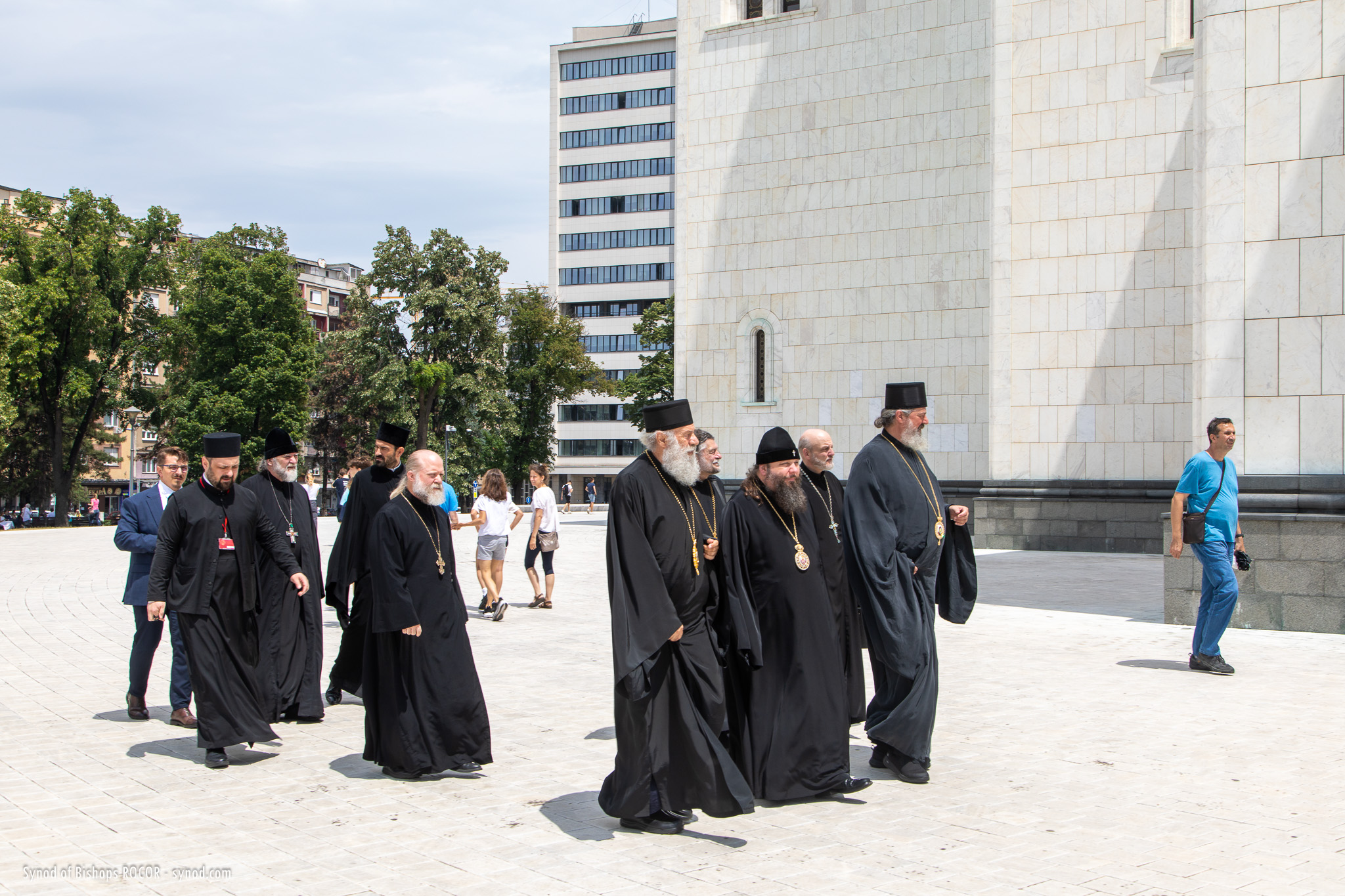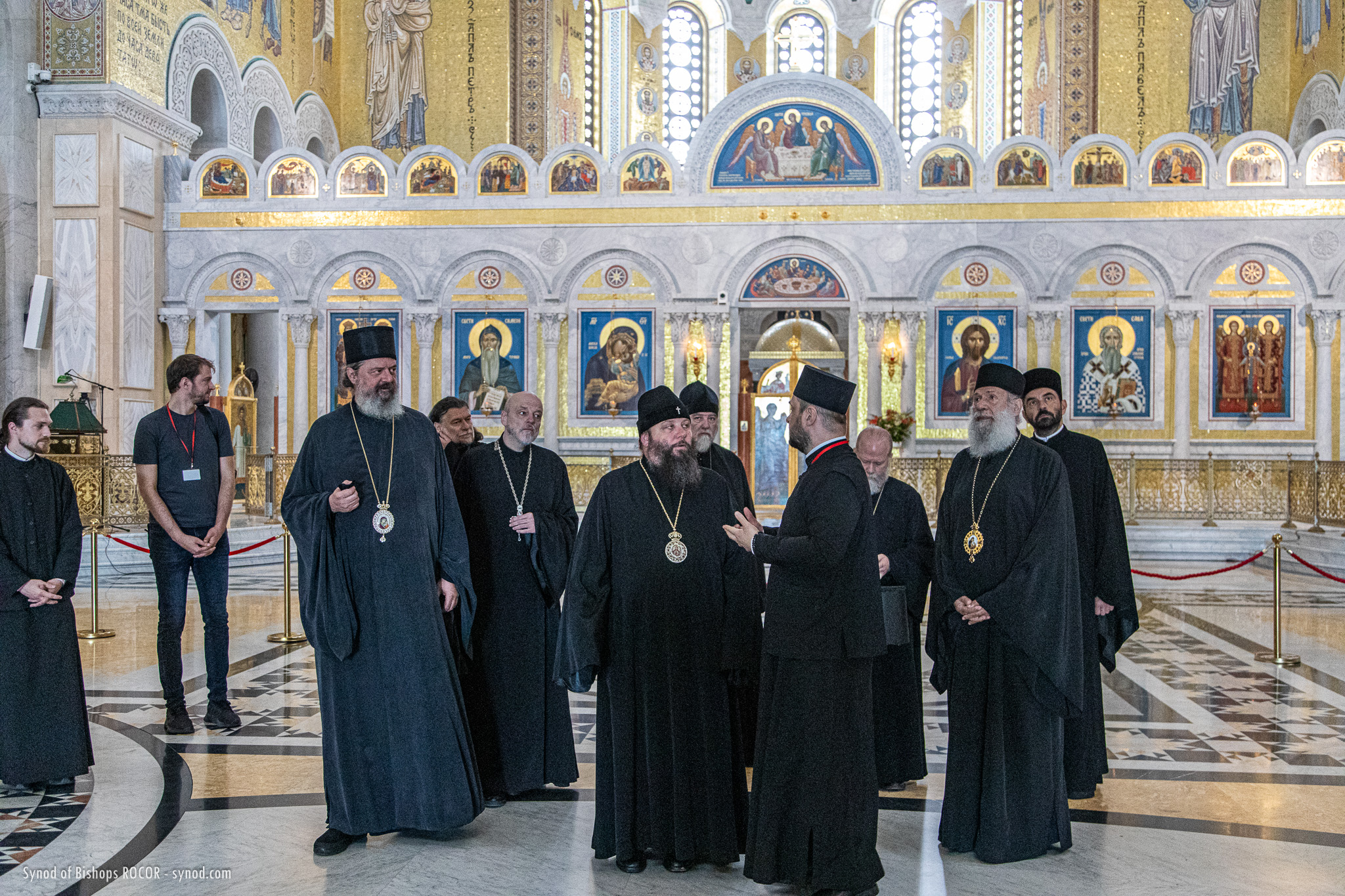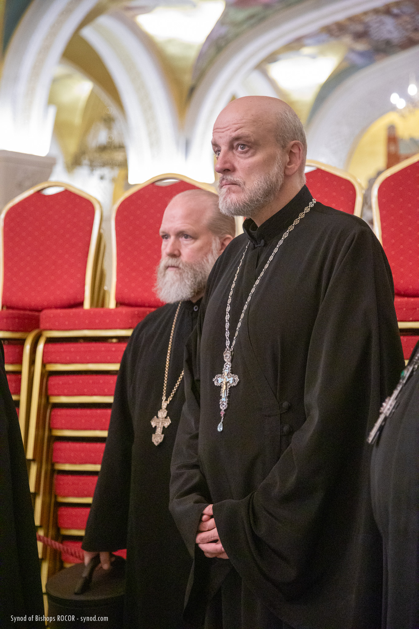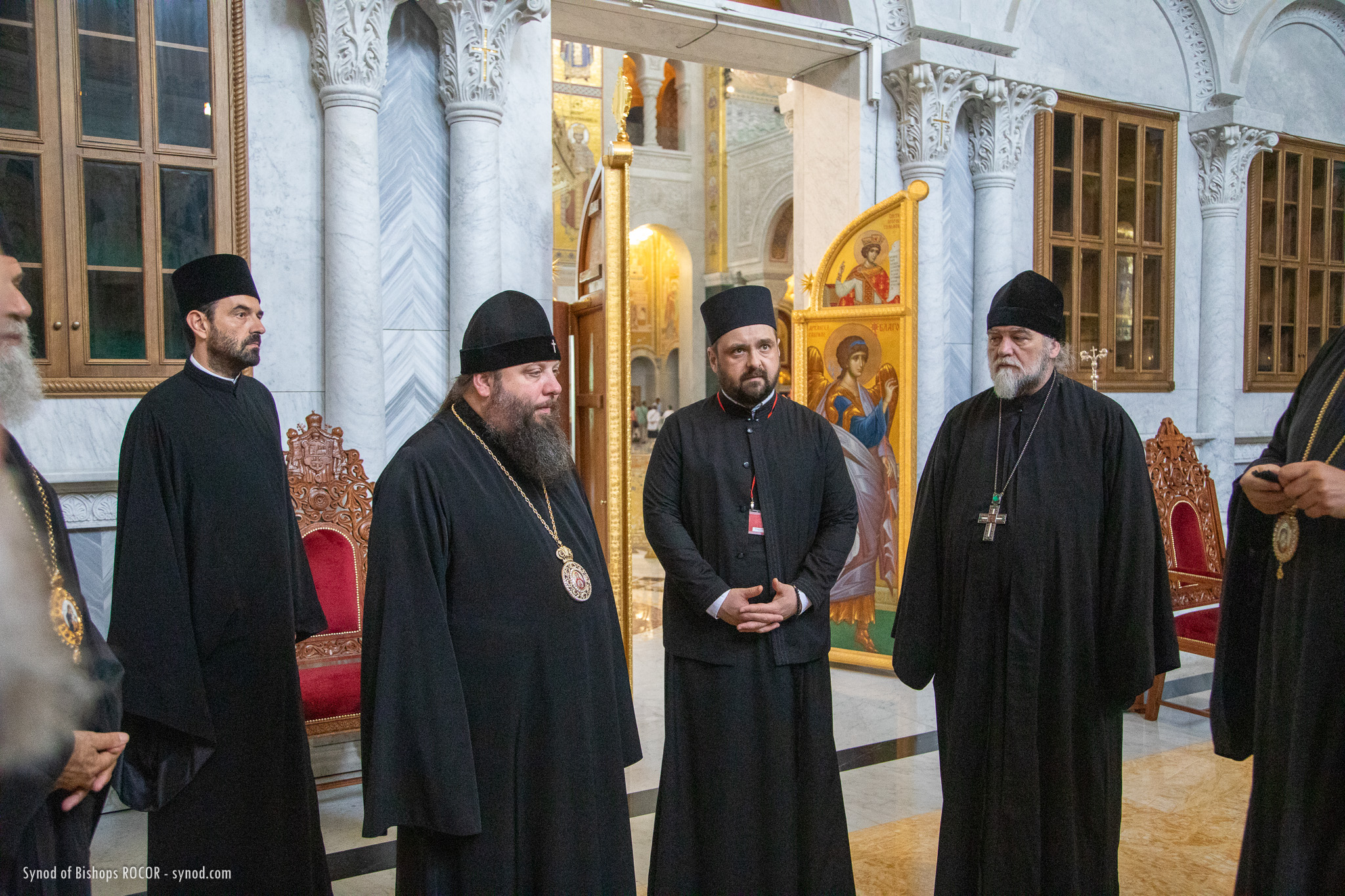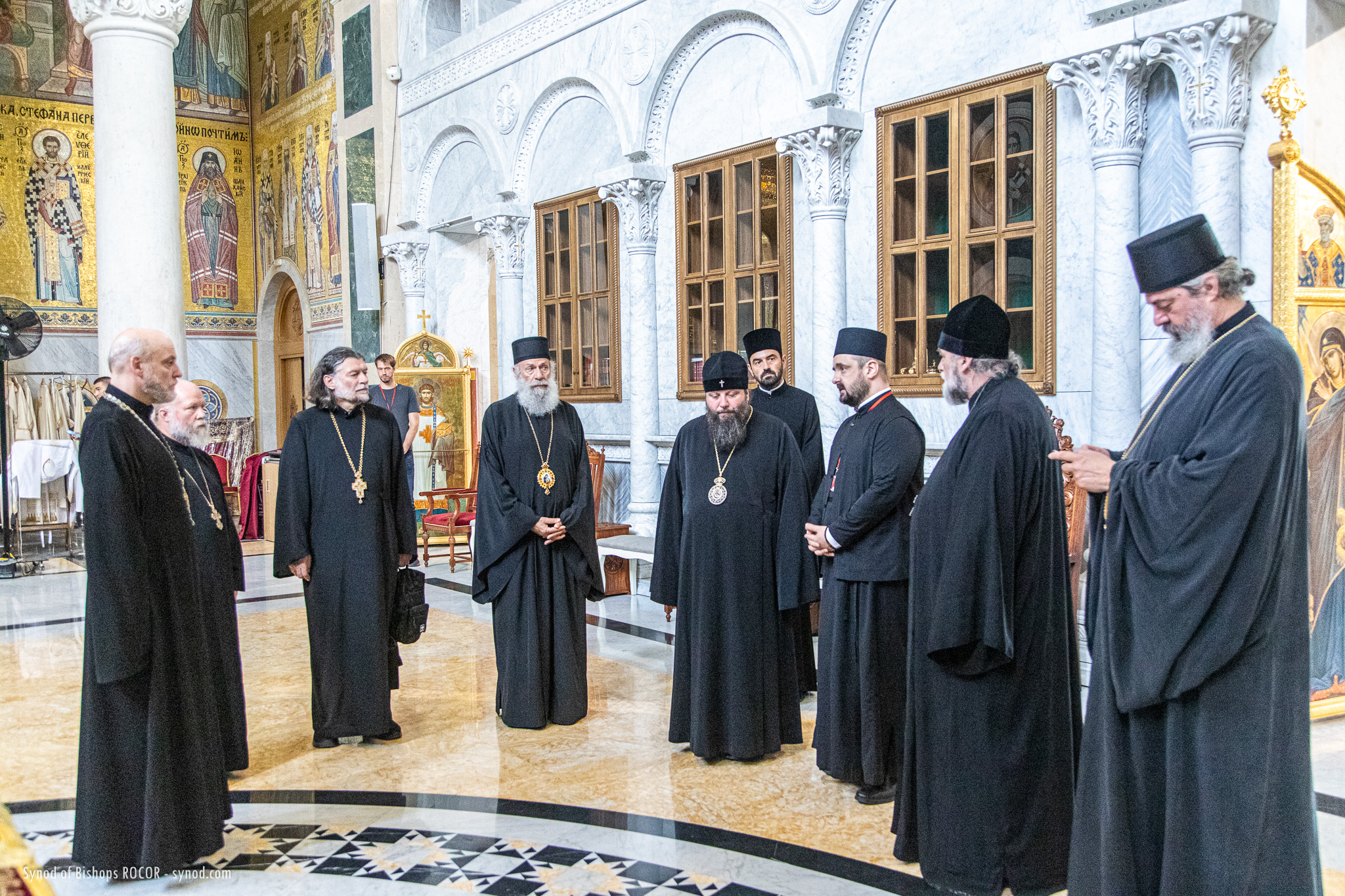 Metropolitan Nicholas is accompanied by members of the Synod of Bishops: His Eminence Metropolitan Mark of Berlin and Germany, His Eminence Archbishop Gabriel of Montreal and Canada, His Eminence Archbishop Peter of Chicago and Mid-America, His Grace Bishop Irenei of London and Western Europe, His Grace Bishop Job of Stuttgart, as well as Protopriest Serafim Gan, Chancellor of the Synod of Bishops and Secretary of the First Hierarch of ROCOR, as well as Archpriest Luka Novakovic and Archpriest Ljubo Milosevic, cleric of the Eastern American Diocese, Secretary of the Diocese of Mid-America, Archpriest Gregory Joyce, and Reader George Konev.