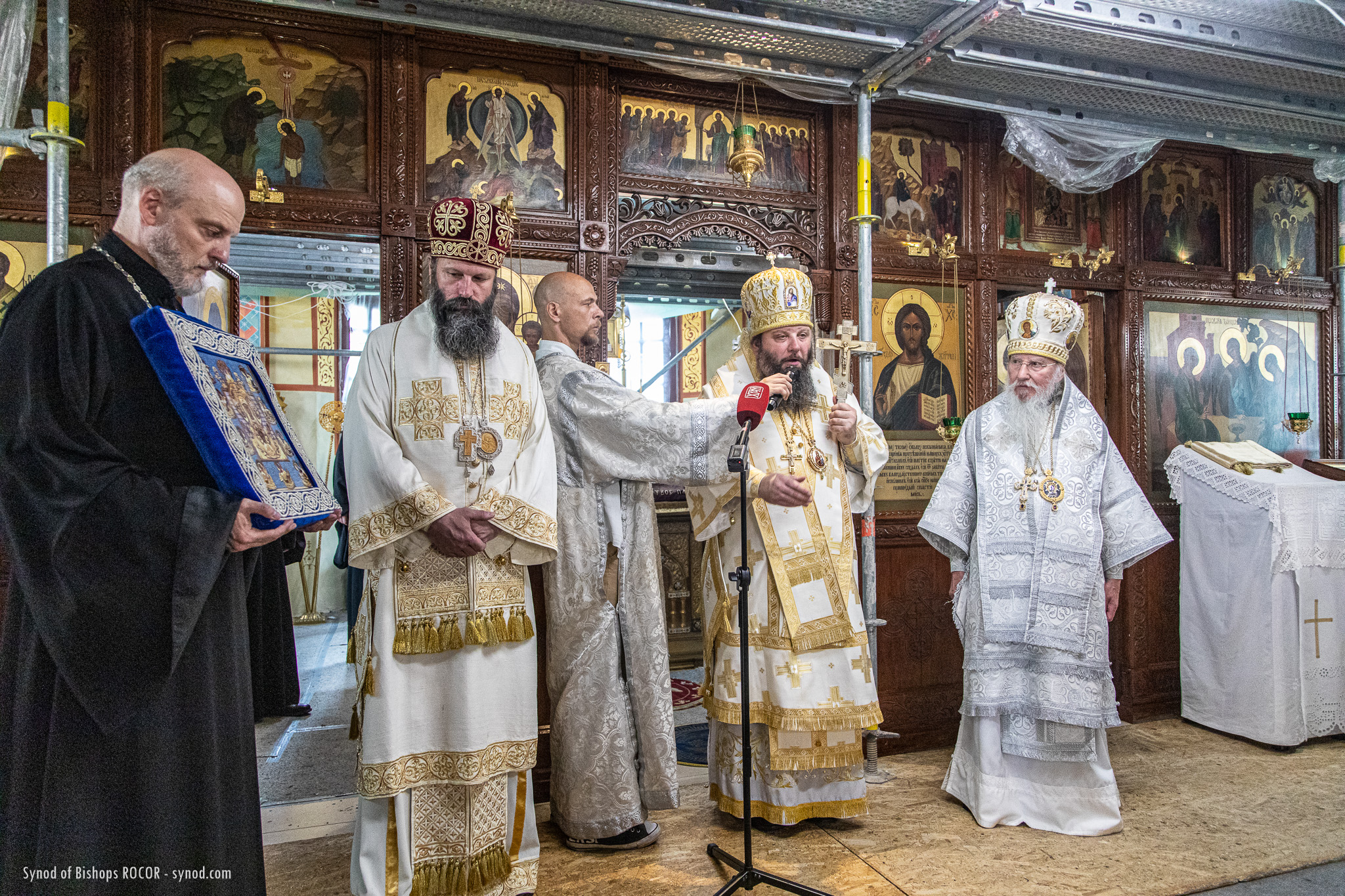 Metropolitan Nicholas is accompanied by members of the Synod of Bishops: His Eminence Metropolitan Mark of Berlin and Germany, His Eminence Archbishop Gabriel of Montreal and Canada, His Eminence Archbishop Peter of Chicago and Mid-America, His Grace Bishop Irenei of London and Western Europe, His Grace Bishop Job of Stuttgart, as well as Protopriest Serafim Gan, Chancellor of the Synod of Bishops and Secretary of the First Hierarch of ROCOR, as well as Archpriest Luka Novakovic and Archpriest Ljubo Milosevic, cleric of the Eastern American Diocese, Secretary of the Diocese of Mid-America, Archpriest Gregory Joyce, and Reader George Konev.