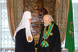 In recognition of his labors for the good of the Holy Church and in connection with his 80th birthday, the Primate of the Russian Orthodox Church presented Archpriest Michael Protopopov with the Order of St Sergius of Radonezh, First Degree.