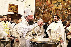 Upon conclusion of Liturgy, Metropolitan Nicholas led the Great Blessing of Water and greeted all with the feast. He reported that the Kursk Root Icon of the Mother of God will be departing on a pilgrimage to Boston and California and will return only in a month’s time; and, on February 8, the myrrh-streaming Hawaiian Iveron Icon of the Mother of God would arrive at the cathedral. The holy icon will remain in the cathedral during the All-Night Vigil on the 15th and Divine Liturgy on the 16th of February, the feast of the Holy Equal-of-the-Apostles Nicholas of Japan.