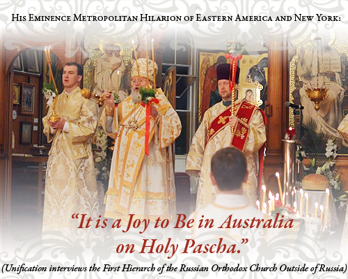 On Pascha Week, the Editor-in-Chief of Unification met with His Eminence Metropolitan Hilarion of Eastern America and New York, First Hierarch of the Russian Orthodox Church Outside of Russia, who also holds the position of Ruling Bishop of the Diocese of Australia and New Zealand. The meeting took place at Vladyka Hilarion�s residence in Croydon at 9 am.