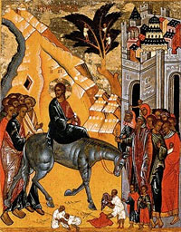 Holy Evangelist John the Theologian notes in his Gospel that before the Lord entered Jerusalem, word of his miracle of the raising of Lazarus performed by Jesus Christ spread like wildfire among the people; news of this astounding miracle lifted the spirits of everyone who revered and loved the Savior. After this, as Holy Evangelist Luke tells us, everyone began joyfully praising God for the wondrous Signs they had seen over this time. It must be noted that the Apostles desired that their Teacher would come to Jerusalem to be glorified there, as an earthly king would be. They thought that this moment had arrived, that Christ enters Jerusalem with Royal glory specifically in order to assume His Throne and reign as king; and they joyously exclaimed: �Hosanna in the highest, blessed is He Who comes in the Name of the Lord.� The people�s exultation was so great that they lay their clothing on the path upon which the Savior traveled, cutting palm fronds and other greenery, blanketing the way for Him, following along, holding these fronds in their hands as symbols of triumph and celebration. �