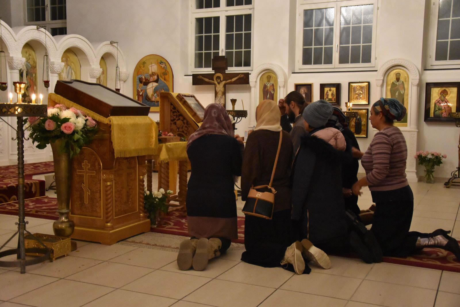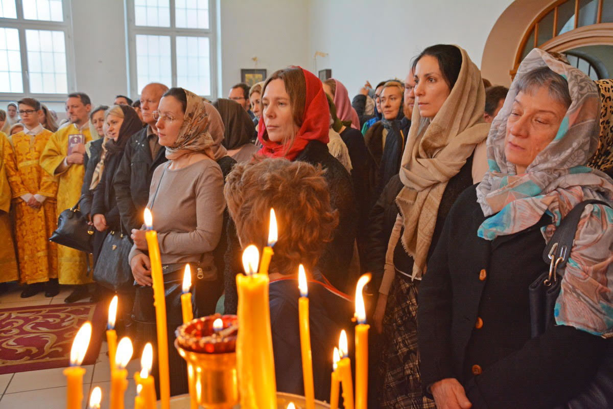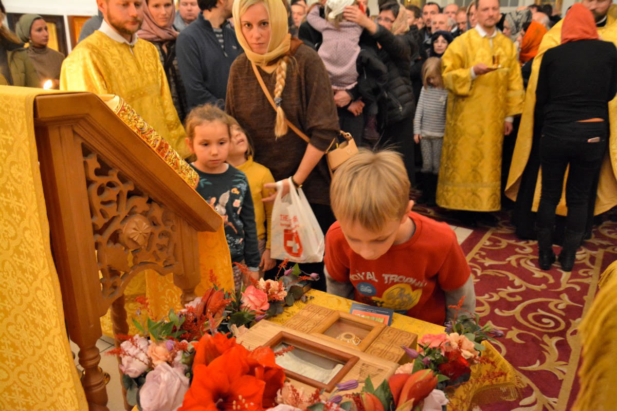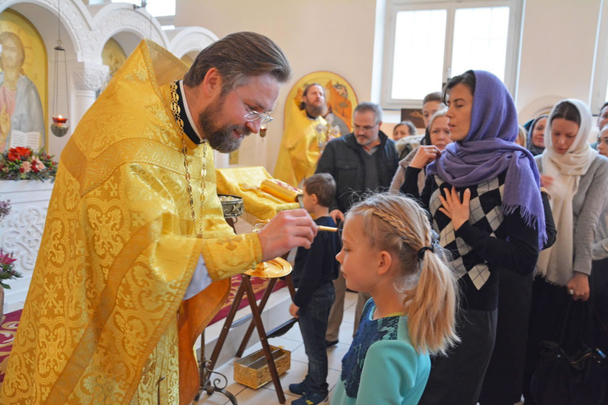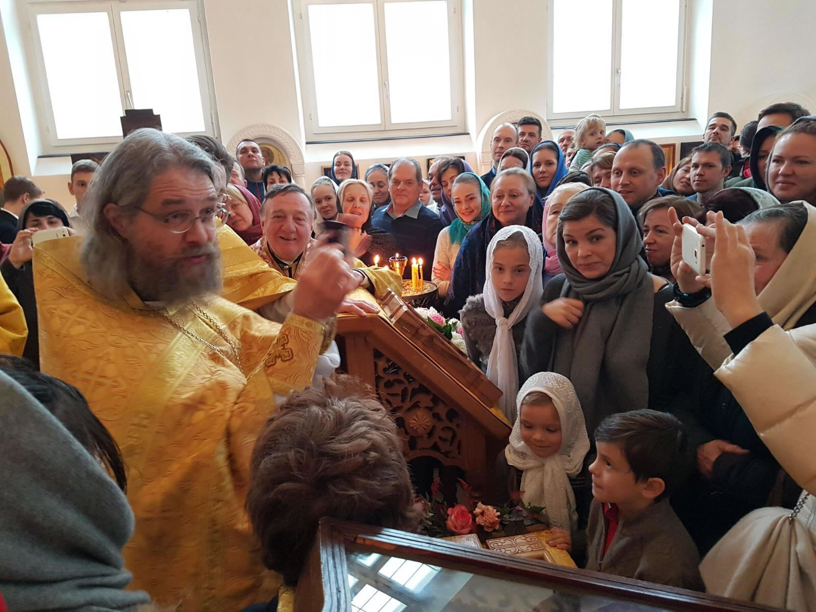 The relics were brought to the church on Saturday evening and greeted by Protopriest Mikhail Zeman, Rector of the church, along with Deacon Daniel Scherer and the church’s choir. A large gathering of faithful from the neighboring Serbian parish along with worshipers from Geneva, Bern, Lausanne, Milan, Cologne and other European cities were on hand. After polyeleos, the worshipers were anointed with oil from the crypt of St John. Two priests listened to confessions from the very beginning of evening service until deep into the night. Parishioners say that there were as many worshipers at the service as during Pascha.