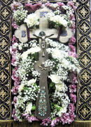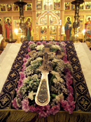 In the middle of Great Lent, on Saturday night during vigil, the Cross is ceremoniously brought out of the altar and placed in the middle of church in order to remind the faithful of the sufferings and death of the Lord, thereby inspiring and encouraging those observing Lent to continue in their spiritual labors. The veneration of the Cross continues during the Fourth Week of Great Lent, until Friday�the entire week is called Veneration of the Cross Week, and the cycle of divine services concentrate on the Cross. This week marks the halfway point of Lent. The meaning of this holiday is that Orthodox Christians, making their spiritual journey to the Heavenly Jerusalem, to the Pascha of the Lord, are in the middle of the path of the �Wood of the Cross.� We gather our strength under the Cross for our continued struggle. The Cross of the Lord heralds Christ�s victory over death�His Holy Resurrection. With the aim of greater inspiration in maintaining patience in our podvigi, the Holy Church reminds us of the approaching feast of Pascha, singing the praises of the sufferings of the Savior, together with His joyous Resurrection: �Before Thy�Cross, we bow down in worship, O�Master, and Thy Holy Resurrection we glorify.�
