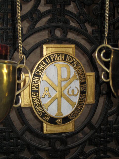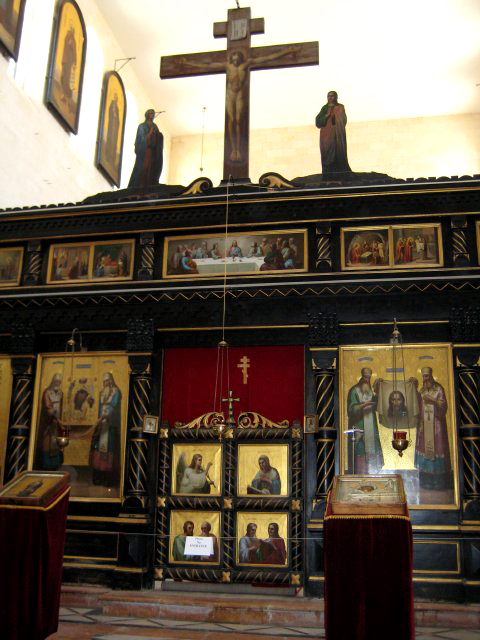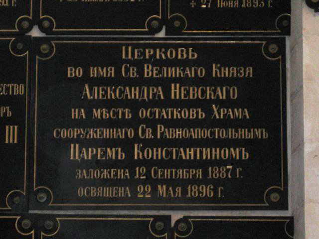 Открытия эти были признаны учеными всего мира. Русское консульство решило строить в другом месте, а над этим священным местом - последним этапом Крестного пути - был воздвигнут храм, немного повыше священного порога на обнаруженной одновременно широкой площадке, повидимому тоже относившейся к базилике Константина Великого. Посреди площадки был найден каменный престол, вероятно придельного храма базилики, которая, как известно, покрывала целый ряд священных мест одною крышей. Этот престол оставили стоять посреди, а перед ним на восток воздвигли алтарь и иконостас, освятив храм в честь святого благоверного князя Александра Невского. Священный порог поместился в том же здании, при котором было выстроено несколько комнат для сдачи в наем паломникам. Порог покрыт деревянной рамой со стеклом. Позади него высится большое Распятие на обломке местного камня. Слева тянется древняя стена, упираясь в стену здания, на которой висит большая икона, изображающая Спасителя, несущего крест. Эти грандиозные остатки стены выходят за пределы русского участка и продолжаются на территории прилегающего абиссинского монастыря.